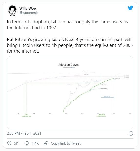 Sin embargo, según un analista, esto es solo el comienzo. El renombrado analista en cadena Willy Woo afirma que las criptomonedas todavía están al comienzo de la adopción masiva cuando se compara la tasa de adopción de Bitcoin con Internet.