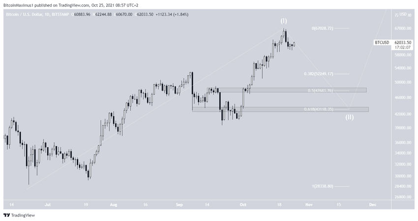 Hay dos conteos potenciales de ondas en juego. El primero sugiere que BTC está en la tercera onda de un impulso alcista, mientras que el segundo muestra BTC en la segunda onda. Un impulso alcista es creado por cinco ondas, tres de las cuales se mueven hacia arriba.
