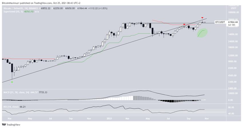 Finalmente, la línea de supertendencia es alcista (círculo verde). La supertendencia es un indicador que utiliza la volatilidad para determinar la dirección de la tendencia. Dado que el precio de BTC está por encima de la línea, la tendencia se considera alcista.