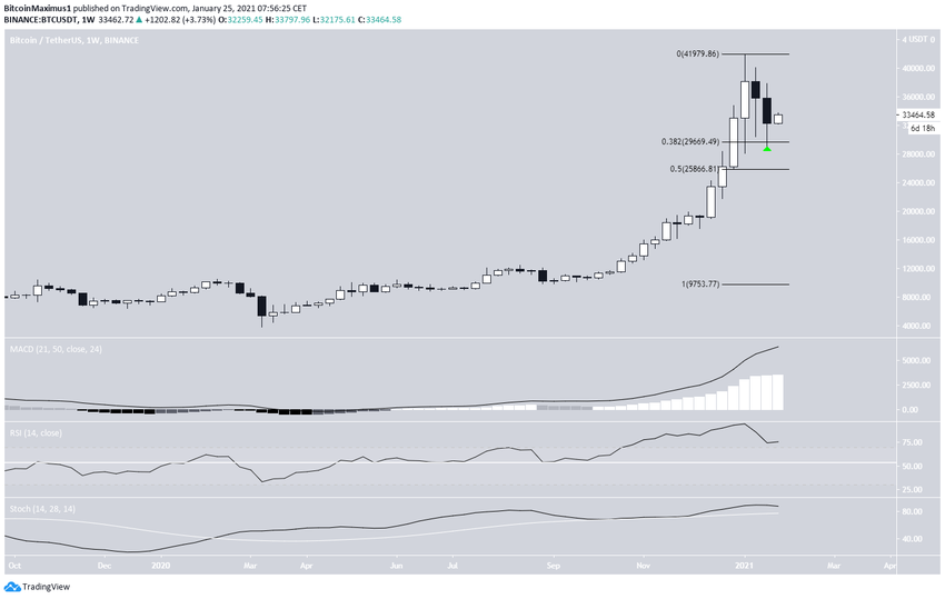 Bitcoin bajó considerablemente durante la semana del 18 al 25 de enero, cayendo hasta un mínimo de 28.850 dólares. Esto creó la segunda vela semanal sucesiva con un cierre bajista.