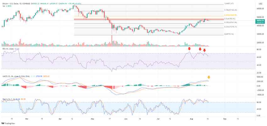 SponsoredLa estructura actual indica claramente una reanudación de la tendencia alcista en el marco de tiempo diario. Sin embargo, el precio de BTC fue rechazado por la resistencia a largo plazo en el rango de 46,800 dólares – 48,000 dólares (rectángulo rojo).