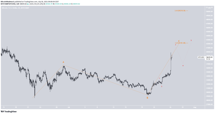 El gráfico de dos horas muestra que BTC está en la sub-onda tres (roja) de un impulso de cinco ondas.