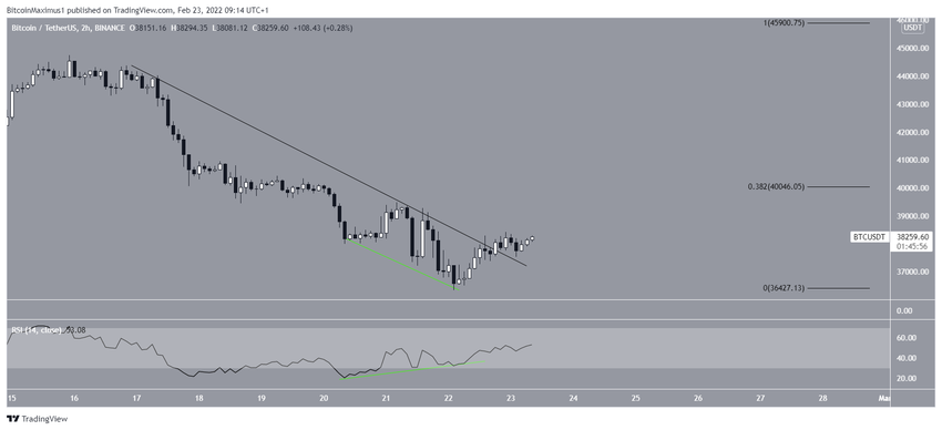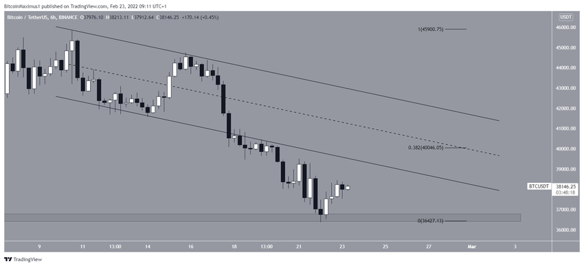 Bitcoin aumentó considerablemente el 23 de febrero, rebotando en el área de soporte horizontal de 36,600 dólares (icono verde). El área ha actuado como soporte desde que comenzó el movimiento alcista el 24 de enero.