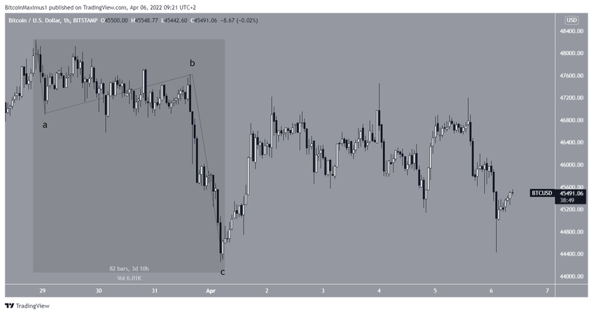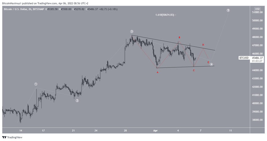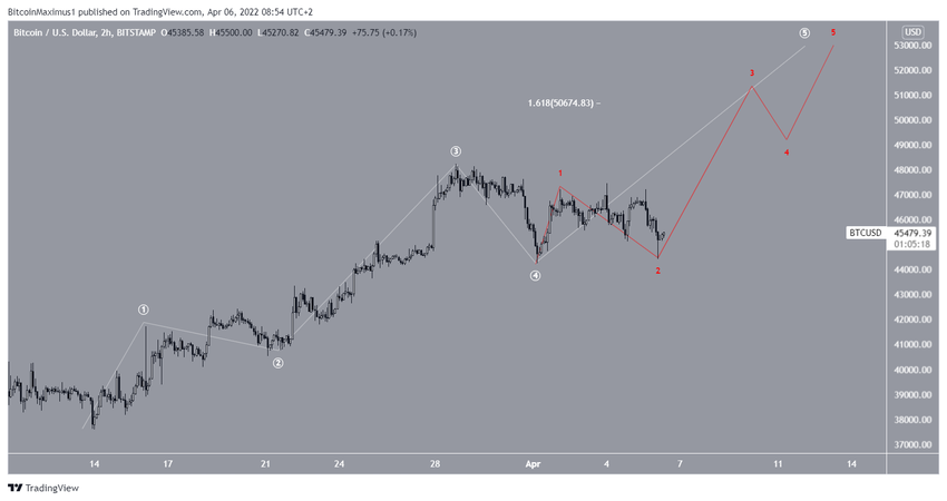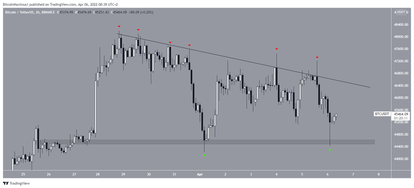 El gráfico de dos horas muestra que BTC ha estado operando por debajo de una línea de resistencia descendente desde el 28 de marzo. Hasta el momento, ha realizado seis intentos de ruptura (iconos rojos), todos sin éxito. El rechazo más reciente ocurrió el 6 de abril y provocó que el movimiento a la baja alcanzara un mínimo de 44,412 dólares el mismo día.