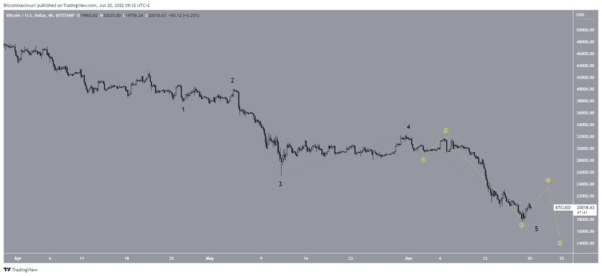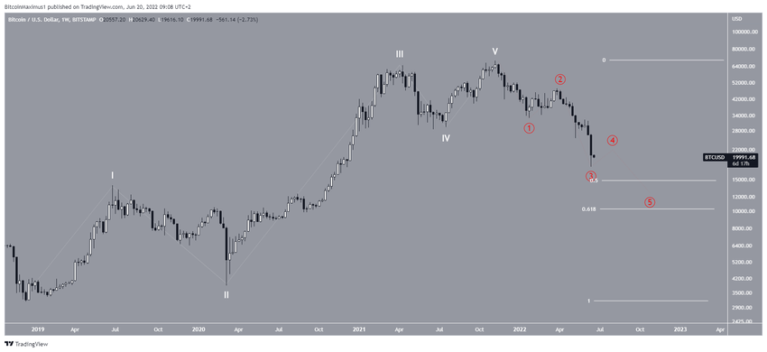 El recuento bajista indica que toda la formación de cinco ondas ya ha llegado a su fin. En esta posibilidad, el precio ha iniciado un nuevo movimiento bajista de cinco ondas (rojo), que lo llevará entre 10.500 dólares y 14.500 dólares, los niveles de soporte de retroceso de Fibonacci de 0,5-0,618.