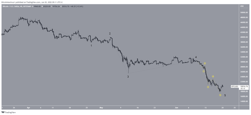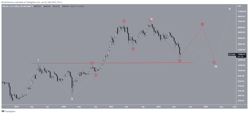 El más optimista sugiere que BTC se está acercando al fondo de la onda cuatro (blanca), de un movimiento ascendente de cinco ondas que comenzó en marzo de 2020.