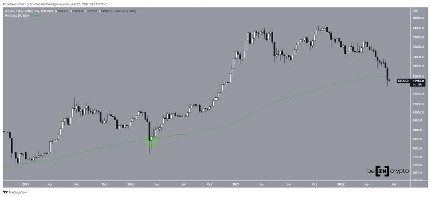 Un desarrollo importante es que el precio ha alcanzado un cierre semanal por debajo de su media móvil (MA) de 200 semanas. Si bien esto ocurrió anteriormente en marzo de 2020 (círculo verde), el precio nunca se mantuvo por debajo de la MA durante un período de tiempo considerable.