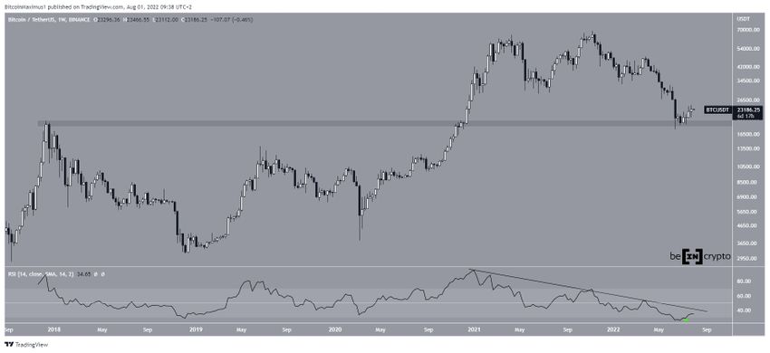 BTC ha estado cayendo desde que alcanzó un precio máximo histórico de 69,000 dólares en noviembre. El movimiento a la baja hasta ahora ha llevado a un mínimo de 17,622 dólares en junio. Bitcoin se ha estado moviendo hacia arriba desde entonces y hasta ahora ha alcanzado un máximo de 24,668 dólares.