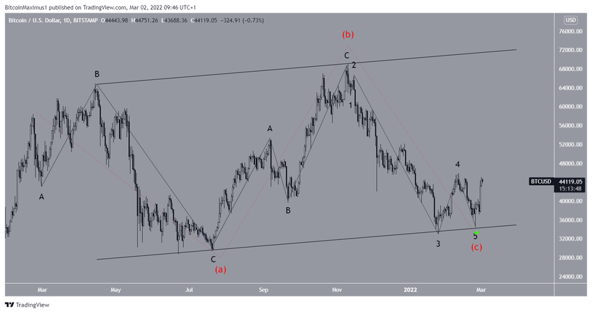Esto indica que toda la estructura era una corrección plana, que estaba contenida dentro de un gran canal paralelo ascendente. Si es correcto, significaría que BTC podría aumentar gradualmente hacia un nuevo precio máximo histórico y el mínimo del 24 de febrero no se romperá.