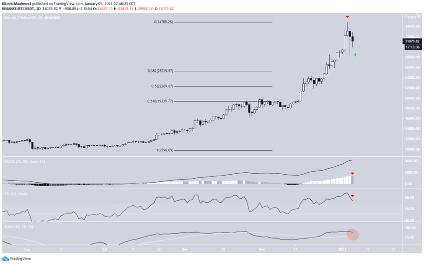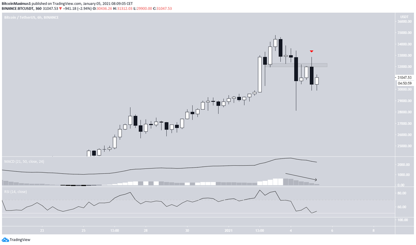 Después de alcanzar un precio máximo de 34.789 dólares el 3 de enero, Bitcoin se estancó al día siguiente, cayendo hasta un mínimo de 28.130 dólares. Sin embargo, procedió a crear una mecha inferior larga (que se muestra con la flecha verde en la imagen de abajo) y alcanzó un cierre de 31.988 dólares.