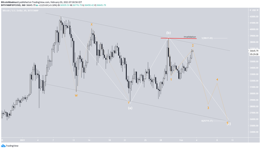 Un aumento por encima del máximo del 29 de enero de $38,620 (línea roja) invalidaría este recuento de onda en particular.
