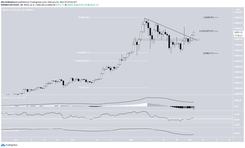 Sin embargo, los indicadores técnicos aún no han confirmado el movimiento alcista, y BTC está cotizando muy cerca de la resistencia de 0,618 Fib en $37.000. Por lo tanto, aún no está confirmado que BTC esté en una tendencia alcista.