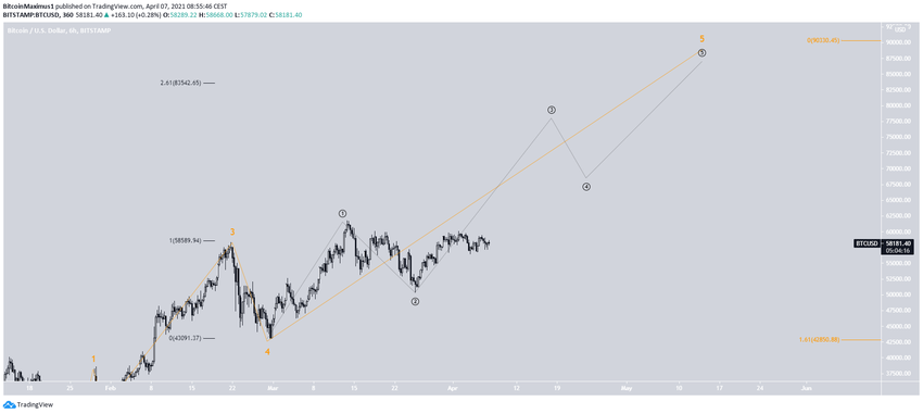 El recuento de ondas indica que BTC se encuentra en la quinta y última subonda (naranja) de un impulso alcista a largo plazo.