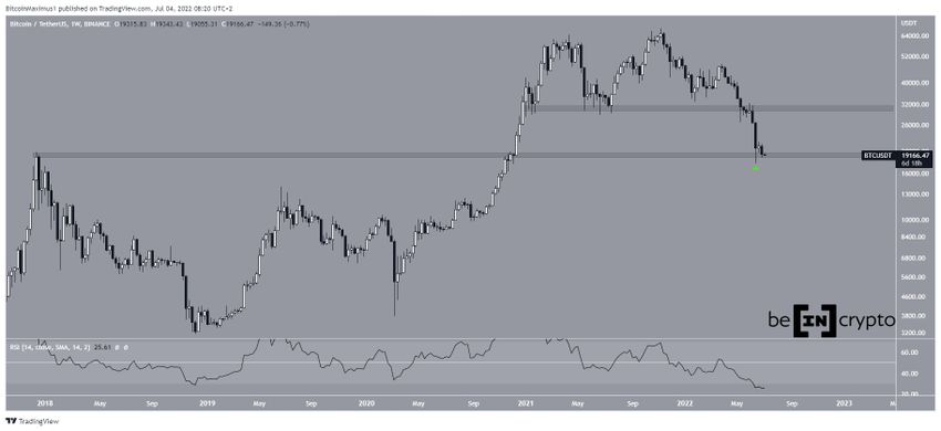 BTC ha estado cayendo desde que alcanzó un precio máximo histórico de 69,000 dólares en noviembre de 2021. Hasta ahora, el movimiento a la baja condujo a un mínimo de 17,622 dólares en junio. El rebote resultante creó una mecha inferior larga.
