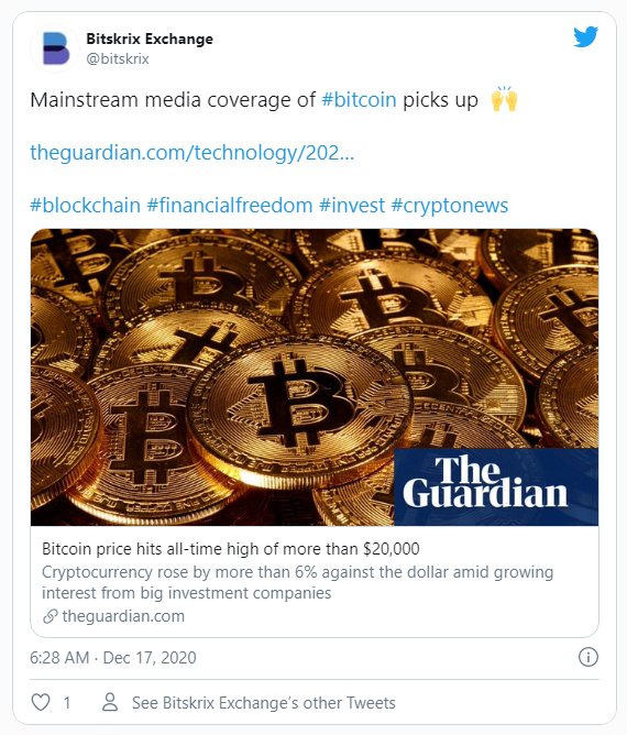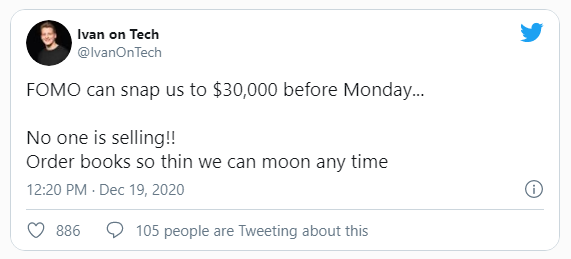 Si bien esas ganancias son lo suficientemente apetitosas, la exuberancia de 2017 aún está presente en Twitter. El popular video blogger, IvanOnTech, sugirió a medias que BTC podría alcanzar los 30,000 dólares el lunes. Eso sin duda sería un re-tweet memorable, si llegara a buen término.