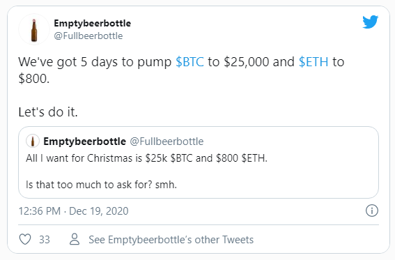 Algunos han especulado que podríamos ver Bitcoin en 25,000 dólares para Navidad. Con las vacaciones a menos de una semana, esto no parece descabellado.