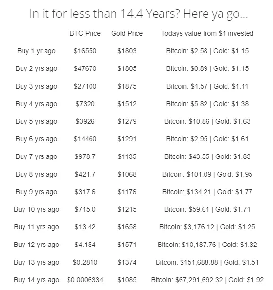 SponsoredComprando BTC por 1 USD hace aproximadamente 14,5 años y no vendiéndolo hasta hoy, la inversión ascendería a 38,5 millones de USD hoy. Sin embargo, si luego invirtieras el mismo dólar en oro, el retorno sería de 1,94 dólares.