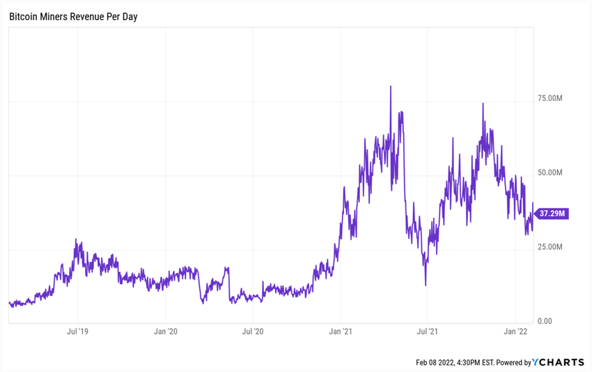 Los ingresos de los mineros se pueden calcular tomando la cantidad de monedas ganadas por el precio de la moneda a su precio de trading en un período determinado. Esto explicaría por qué hubo una disminución en el valor de los ingresos mineros en enero de 2022.