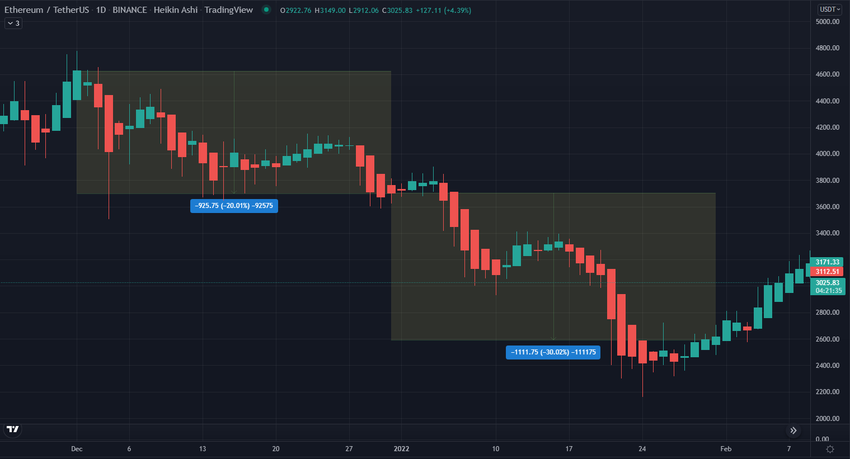 El declive se volvería más violento en enero de 2022. Ethereum se desplomaría un 29% más a finales de enero de 2022, alcanzando un precio de 2,688 dólares. En cuestión de dos meses, Ethereum había perdido casi el 40% de su capitalización de mercado.