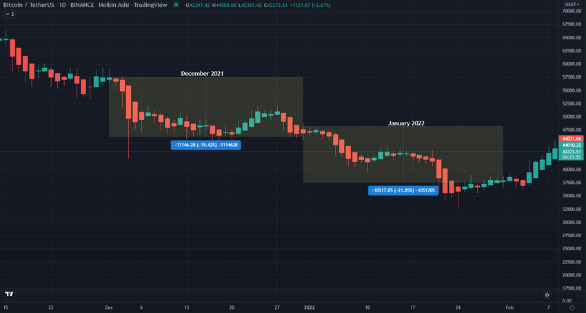 A finales de enero de 2022, Bitcoin y Ethereum habían visto caídas de precios del 44% y 45% respectivamente, desde sus máximos históricos en noviembre de 2021.
