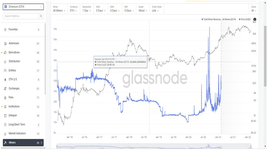 Antes de la caída general de los ingresos por minería en 2022, en diciembre de 2021 los ingresos por minería de Ethereum superaron a Bitcoin en un 32%, siendo Ethereum un claro favorito en enero de 2022, con un 20% más de ingresos que Bitcoin.
