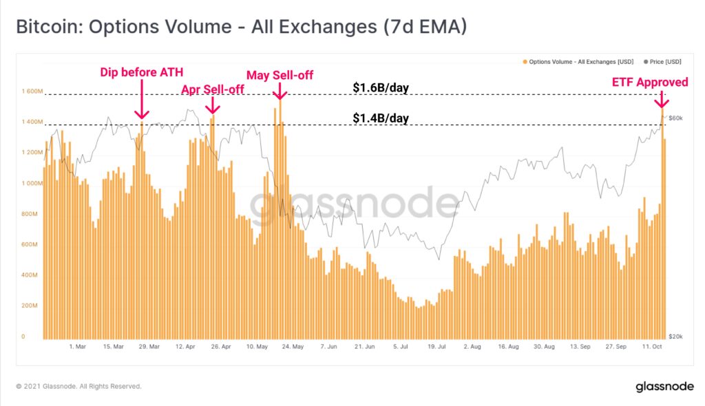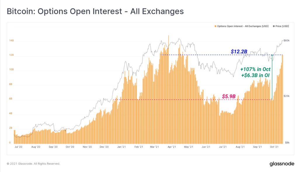 Queda claro que la subida del precio de BTC desde septiembre a octubre ha sido muy clara y decidida. Glassnode muestra que el volumen de opciones como del interés abierto se ha disparado durante el mes de octubre.