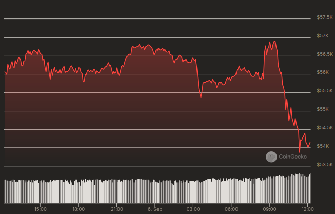 Tras comenzar el día cotizando en 56,665 dólares, Bitcoin ha experimentando una tendencia bajista significativa y acumula una caída del 3.5% a lo largo de la jornada. En cuestión de dos horas, su precio cayó abruptamente hasta los 53,870 dólares, una pérdida de 3,000 dólares.