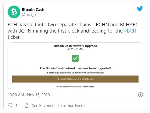 El hard fork planificado ocurrió el 15 de noviembre, dividiendo la red Bitcoin Cash en dos cadenas separadas: Bitcoin Cash Node (BCHN) y Bitcoin Cash ABC (BCH ABC).