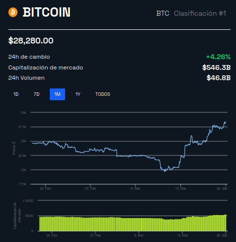 Durante el domingo 19 de marzo, el precio de Bitcoin aumentó más del 4% para alcanzar un nuevo máximo anual de 28,509.45 dólares.