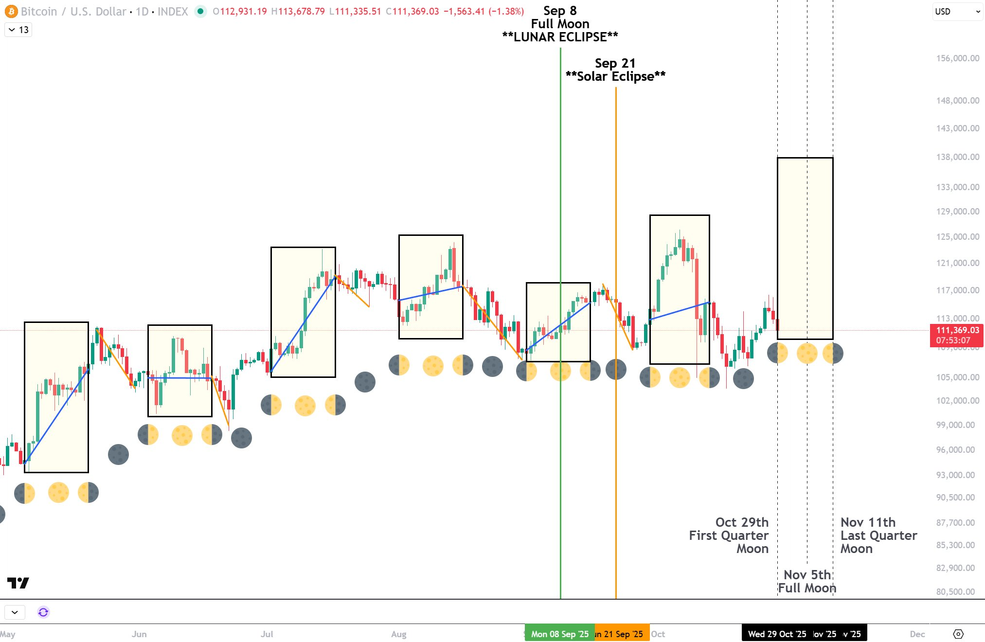 El mes de noviembre llega cargado de simbolismo cósmico y predicciones poco convencionales. Entusiastas plantean que Bitcoin podría enfrentar un período de alta volatilidad influenciado por las fases lunares, por 3I/ATLAS y por tensiones planetarias entre Urano, Mercurio y Marte.