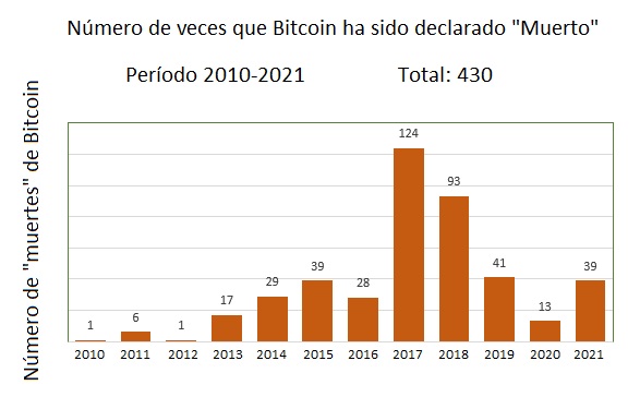 Al evaluar los datos de una forma más amplia, se nota que el 2021 no es una excepción. Desde el año 2010 Bitcoin ha sido “asesinado” en 430 ocasiones.