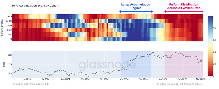 Glassnode reveló que la acumulación disminuyó a medida que crecía la incertidumbre macroeconómica, especialmente tras eventos como el hack de Bybit y el aumento de las tensiones arancelarias en EE.UU..