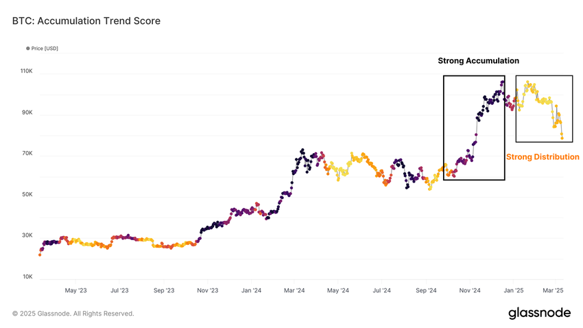 Además, Glassnode destacó que el Accumulation Trend Score permanece por debajo de 0.1.