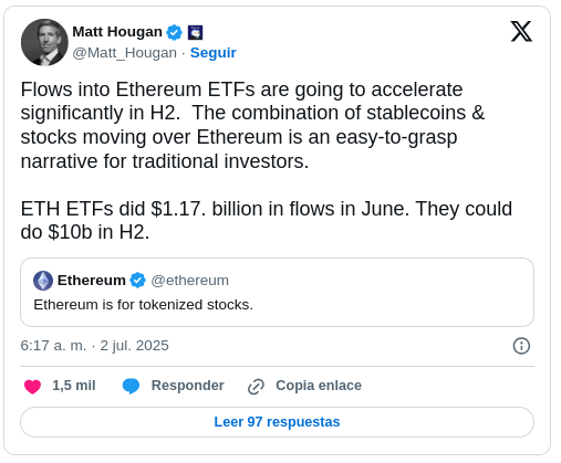 Esto se alinea con una reciente publicación del CIO de Bitwise, Matt Hougan, quién pronosticó un explosivo segundo semestre para los ETF de Ethereum.