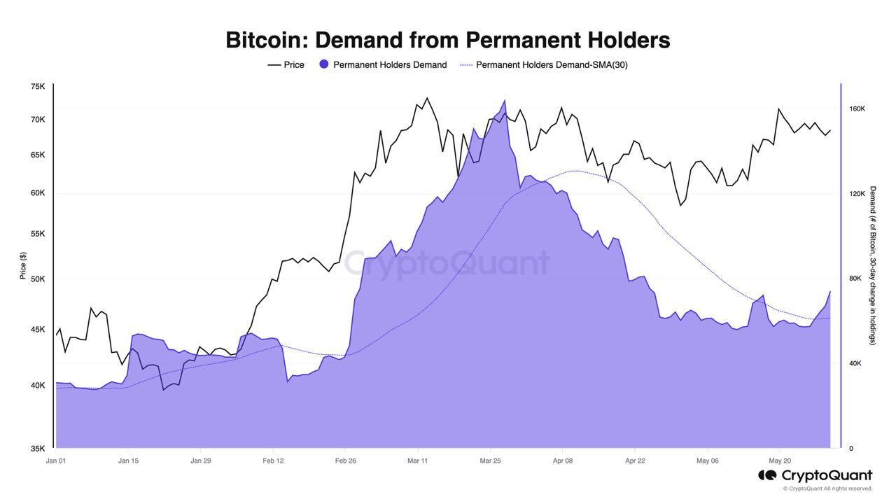 “La estabilización y luego ligero aumento de la demanda de Bitcoin por parte de los holders permanentes y los grandes holders (ballenas). Esto indica un mayor crecimiento de la demanda este mes en comparación con abril. Los holders permanentes han comprado 74K Bitcoin en los últimos 30 días, mientras que la demanda de las ballenas está creciendo un 5% MoM ahora. Ver segundo y tercer gráfico. Todavía necesitamos ver un mayor crecimiento de la demanda de estas cohortes de inversores para que el rally de precios sea sostenible.”