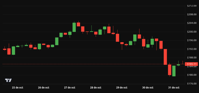 Solana cotiza en torno a 185 dólares, tras registrar caídas significativas durante la semana. La zona de soporte de 170-190 dólares es clave para que el activo mantenga su estructura técnica.