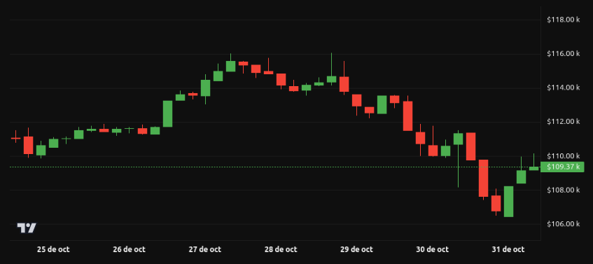 Bitcoin cotiza actualmente cerca de 110,000 dólares, tras ceder desde niveles superiores recientemente. Durante la semana, perdió soporte intermedio que había defendido previamente, lo que indica que la presión vendedora ha ganado terreno.