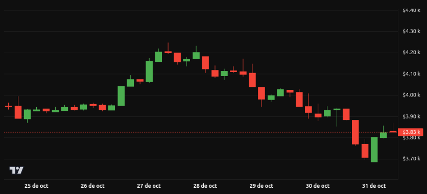 Ethereum está cotizando alrededor de 3,840 dólares tras una fuerte caída durante la semana. El soporte relevante se ubica en 3,900-4,000 dólares, mientras que la resistencia inmediata se sitúa cerca de 4,450-4,500 dólares.