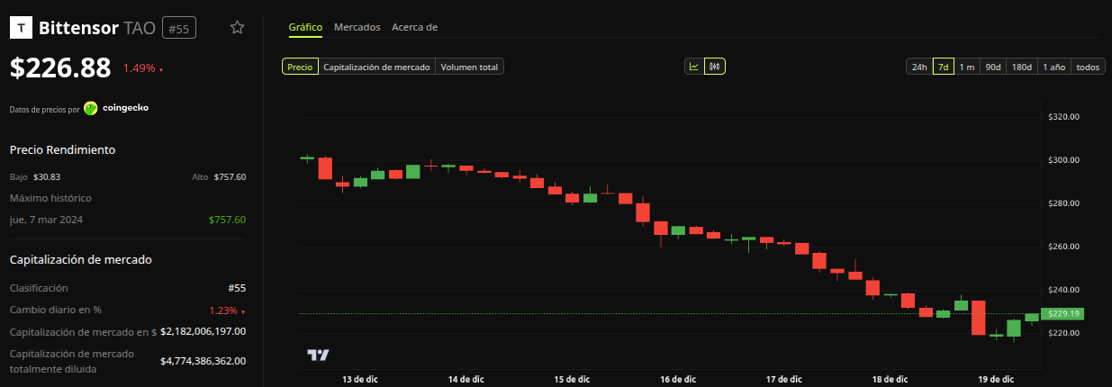 Bittensor continúa mostrando un perfil de alta volatilidad, característico del activo. Esta semana, el precio se ha desplazado dentro de un rango amplio, aproximadamente entre los 216 y los 238 dólares, reflejando movimientos rápidos y reacciones intensas en niveles técnicos.
