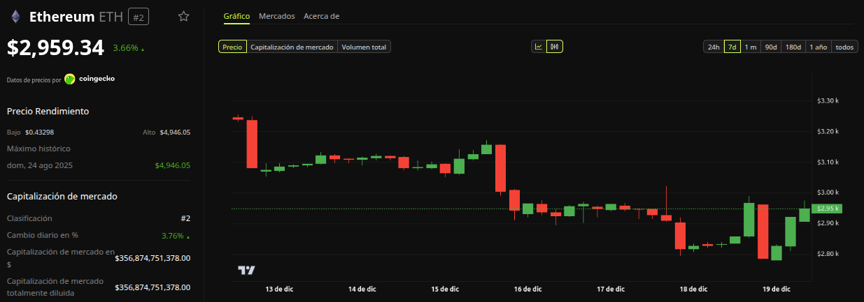 Ethereum ha mostrado un comportamiento ligeramente más dinámico que Bitcoin, aunque sigue condicionado por el entorno general. El precio se ha movido esta semana entre los 2,780 y los 3,000 dólares, con especial atención en la zona psicológica de los 3,000 dólares, que continúa actuando como resistencia relevante.