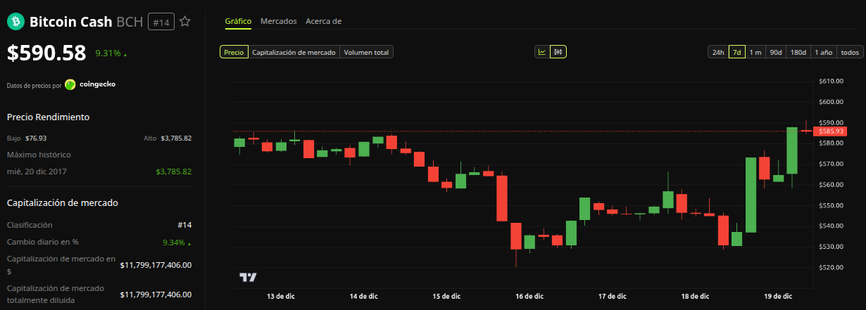 Bitcoin Cash ha sido uno de los activos con mejor desempeño relativo esta semana. El precio ha mostrado una recuperación más decidida, moviéndose entre los 535 y los 590 dólares, con una estructura de máximos y mínimos crecientes en el corto plazo.