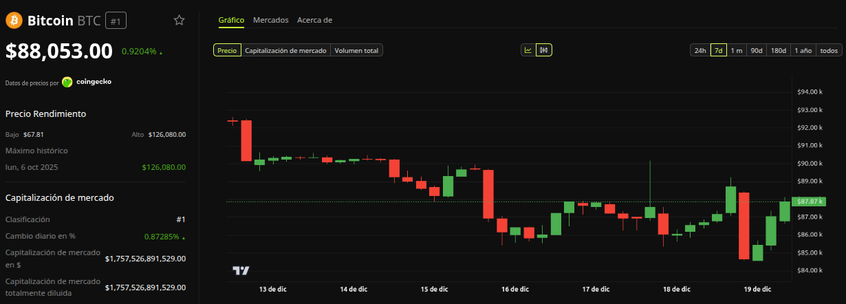 La zona de los 88,000–89,000 dólares se ha comportado como un techo relevante, donde aparece oferta de manera recurrente. Mientras Bitcoin no logre cerrar con claridad por encima de ese nivel, es probable que continúe alternando entre rebotes y retrocesos dentro del rango.
