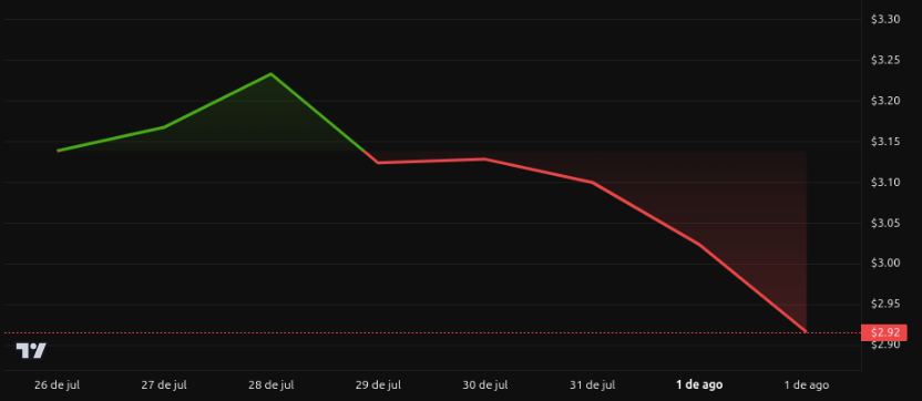 Técnicamente, el soporte crítico está entre 2.84 y 2.90 dólares; sin recuperarse por encima de 3.10 dólares, el siguiente piso relevante ronda los 2.60‑2.70 dólares. La presión bajista se vio acompañada por una disminución en las direcciones activas, reflejando menor interés de nuevos participantes.