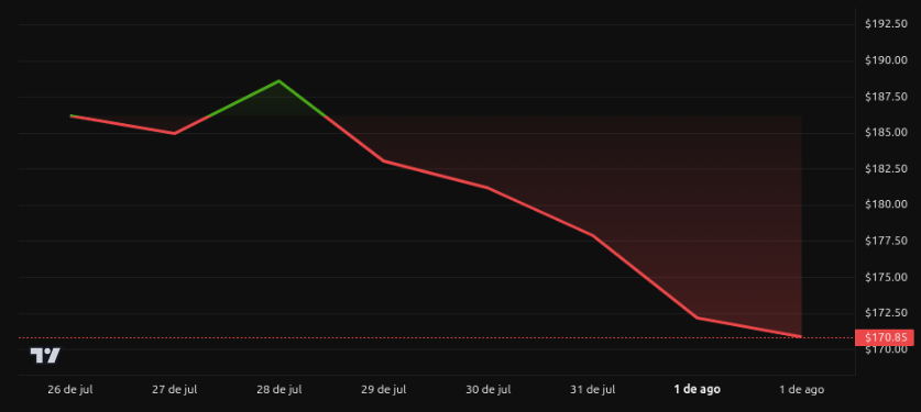 El RSI se aproxima a niveles de sobreventa, lo que podría facilitar un rebote técnico en el corto plazo. Soporte clave en 167‑170 dólares. Si se sostiene, es posible un rebote hacia 180 dólares; si lo pierde, podría buscar el siguiente soporte en 150‑155 dólares.