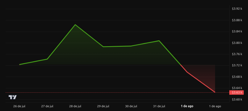 A nivel técnico, la estructura muestra mínimos descendentes, lo que alerta sobre una continuación de tendencia bajista a corto plazo. El soporte inmediato está en 3,600 dólares, con resistencia técnica en la zona de 3,800‑4,000 dólares.