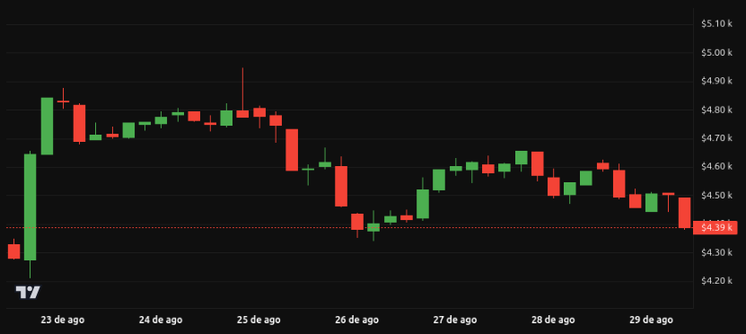 Ethereum mostró movimientos más estables que Bitcoin. Durante la semana osciló entre los 4,365-4,610 dólares, cerrando en torno a 4,367 dólares. La volatilidad intradía fue marcada, pero el soporte en 4,350 se mantuvo.