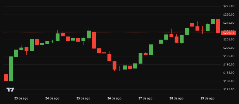 Solana cotizó entre 207-217 dólares a lo largo de la semana, cerrando en torno a 207 dólares. Aunque corrigió respecto a los máximos recientes, aún mantiene una estructura técnica favorable en el mediano plazo.