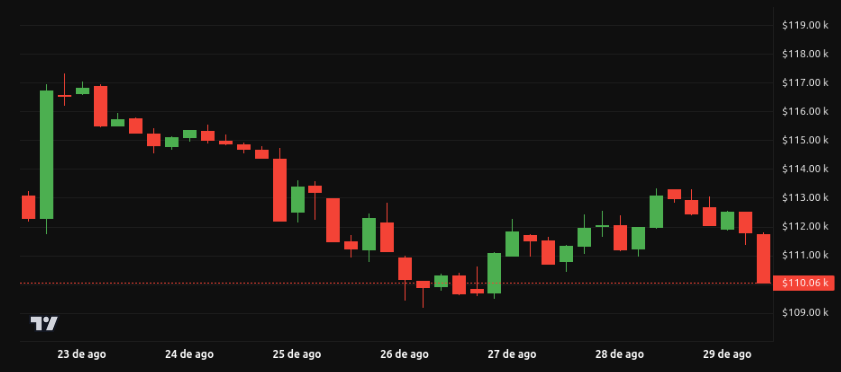 Bitcoin abrió la semana en torno a los 113,000 dólares y superó brevemente los 116,000 dólares, pero la presión vendedora lo llevó a retroceder hasta un cierre cercano a 110,000 dólares. El impulso bajista se acentuó tras la debilidad en activos de riesgo y la fortaleza del dólar.