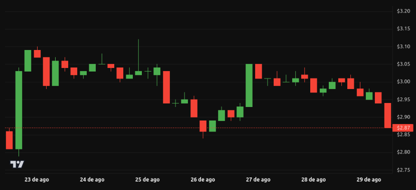 XRP volvió a mostrar debilidad. La semana cerró en torno a 2.87 dólares, tras haber probado máximos intradía cerca de 3.02 sin lograr sostenerlos. El nivel de 3.00 dólares funcionó como resistencia fuerte, y la incapacidad de romperlo dejó al activo bajo presión.