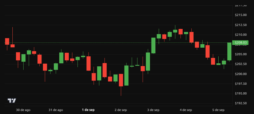 La resistencia más inmediata se encuentra en 215–220 dólares: si logra superarla con un incremento de volumen, el activo podría encaminarse hacia los 225 dólares, consolidando un impulso renovado. En caso contrario, se mantendría el rango lateral en torno a los 200–210 dólares.